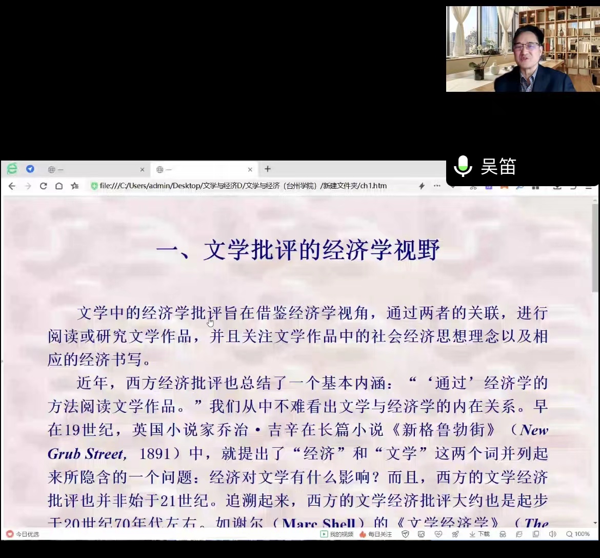12月8日晚,浙江大学世界文学与比较文学研究所所长,博士生导师吴笛教授受外国语学院邀请,面向商务英语和文学方向的教师在线作一场题为《经济批评:文学与经济的交汇与互动》的学术讲座。本次讲座由刘富丽副院长主持。