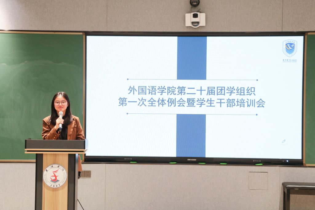 11月13日中午,外国语学院于A6教室召开了第二十届团学组织第一次全体例会暨学生干部培训会。本次例会由团学组织主席团成员出席,学生会主席柯施伊主持,全体干部干事参加。
