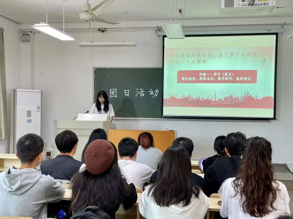 各班团支书通过PPT展示,聚焦党的二十大精神,与全班同学共同领会新时代中国特色社会主义思想。团支书从一个中心任务、“两步走”战略安排、三个“务必”、五个“必由之路”、六个“必须坚持”等多方面内容入手,通过问答、观看视频等方式,与同学们一起学习。同学们在此次团日活动中,加深了对党的二十大精神的理解,提高了思想觉悟,对于如何成为一个有理想、有本领、有担当的新时代中国青年有了更深的体会。