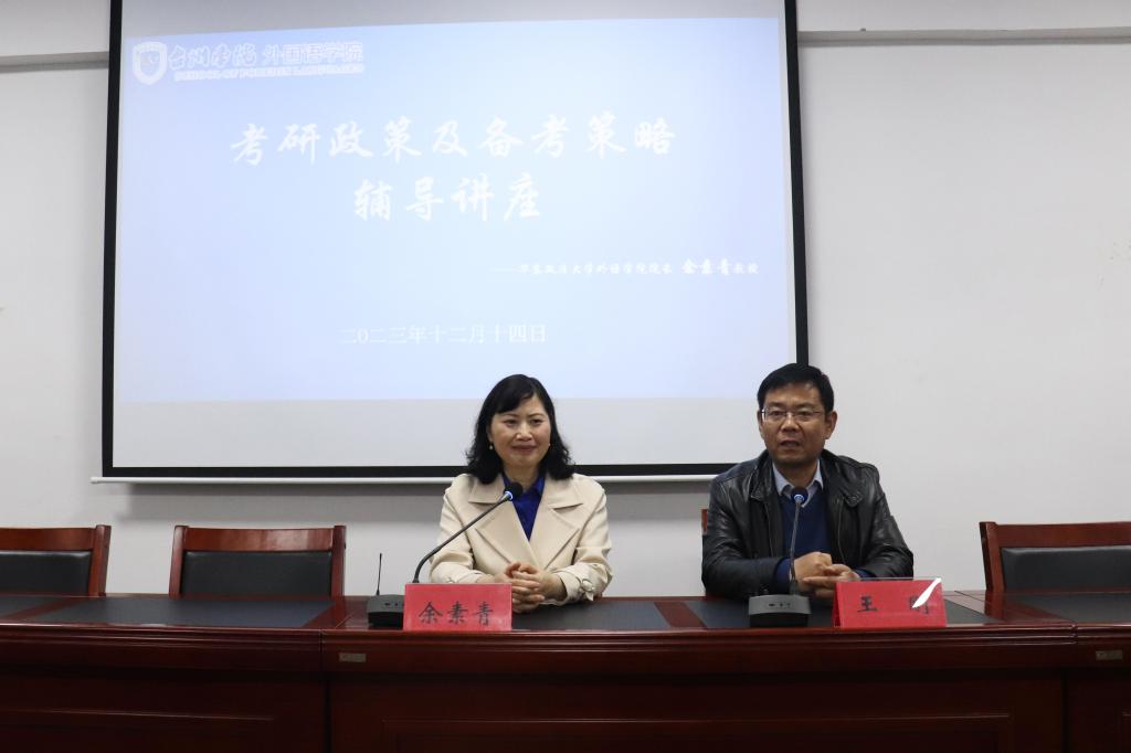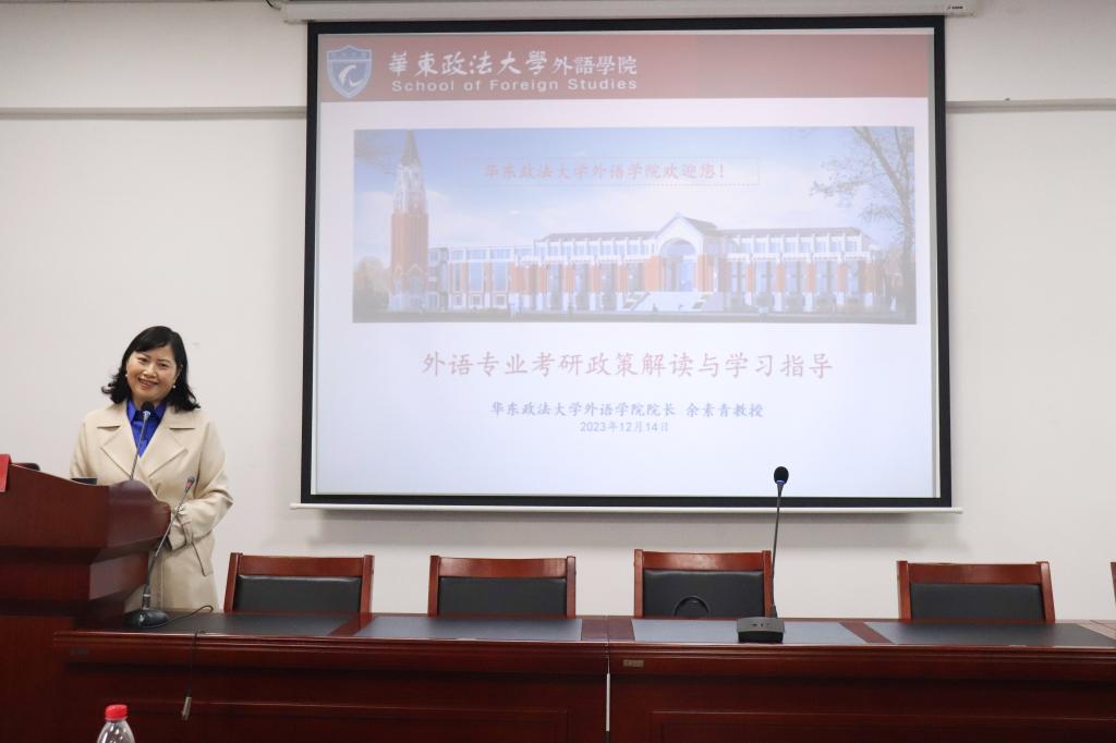 12月14日下午,外国语学院于4204报告厅开展了“考研政策及备考策略辅导”的讲座。本次讲座邀请了华东政法大学外语学院院长余素青教授,由外国语学院院长王刚出席,学院党委副书记鲁建波主持,21级、22级学子参加。