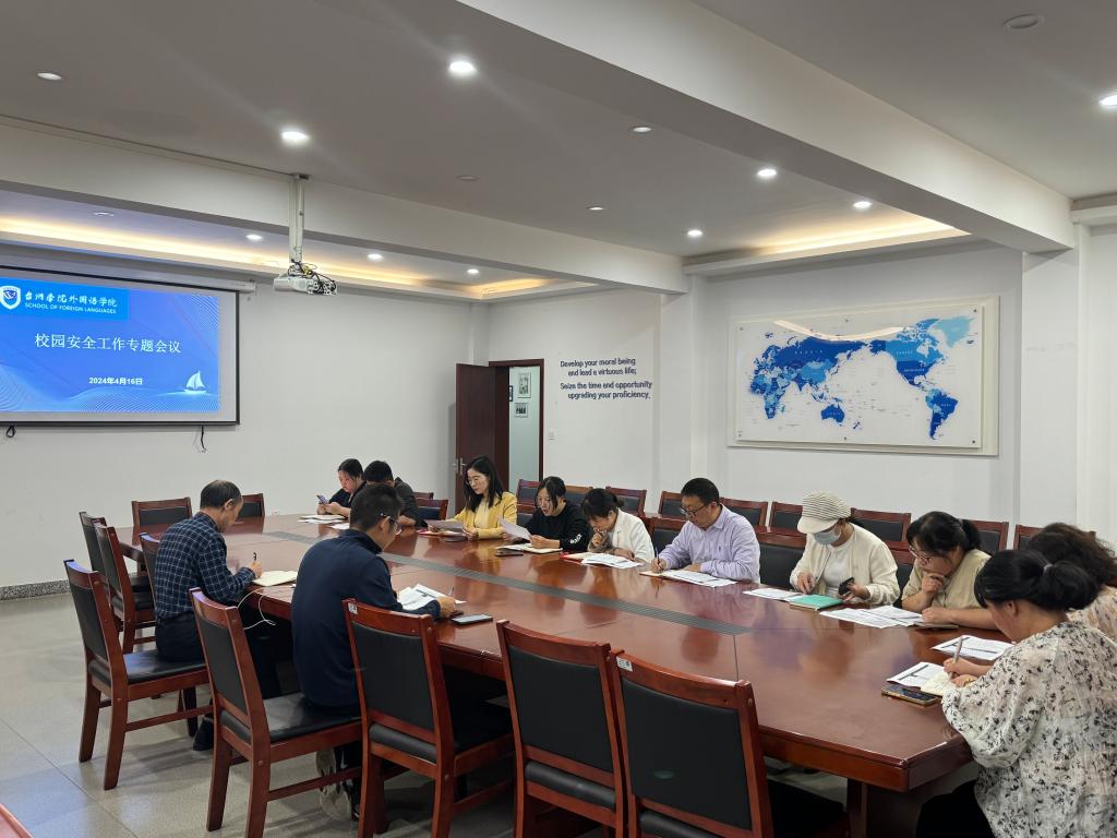 4月16日下午,外国语学院于4102会议室组织召开校园安全工作专题会议。学院党委书记李涛、党政办、教务办、学工办全体人员参加,会议由学院党委副书记鲁建波主持。