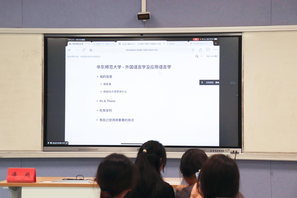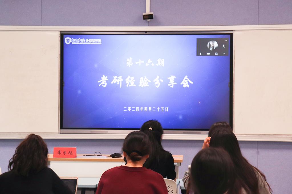 为加强学生对考研知识和经验的了解,明确考研目标,掌握相关考研技巧,外国语学院于4月25日下午在1101开展“研行有你,未来可期”——第十六期考研线上分享会,本期分享会以如何选择专业,如何选择学校为主题,邀请考取西安石油大学的李米艳同学、考取华东理工大学的张云同学、考取浙江工商大学的陈星兰同学、考取华东师范大学的潘越同学进行经验交流,各年级考研学子参加。