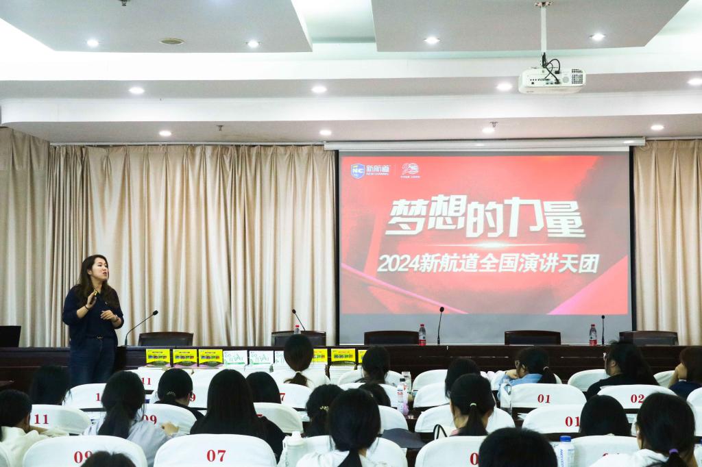 首先,陈鹏帆详细介绍新航道国际教育集团的发展历程、当前状况以及能够为台州学院学生提供的全方位服务。随后,高伟围绕“梦想的力量”这一主题展开深入剖析。她深入探讨了升学及其他更广阔发展道路的可能性,着重分析了海外考研作为多数人的选择及其背后的原因,并强调了提前规划留学事项的重要性。高伟还以自身经历为例,分享了成功路上的心得体会,并向大家推荐了一些对学习有益的方法和软件。最后,她还为大家准备了备考时间表、图书清单以及小礼品,表达了对同学们的关怀与鼓励。