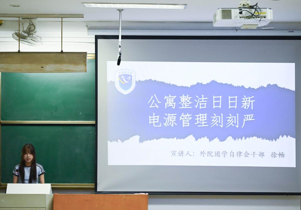 关于公寓安全方面,徐畅向新生们详细介绍了公寓的各项规章制度,包括作息时间、卫生要求、用电安全等。在安全知识讲解环节,通过实际案例展示了因违规用电、私拉乱接等行为可能引发的火灾隐患,让同学们深刻认识到安全用电的重要性。