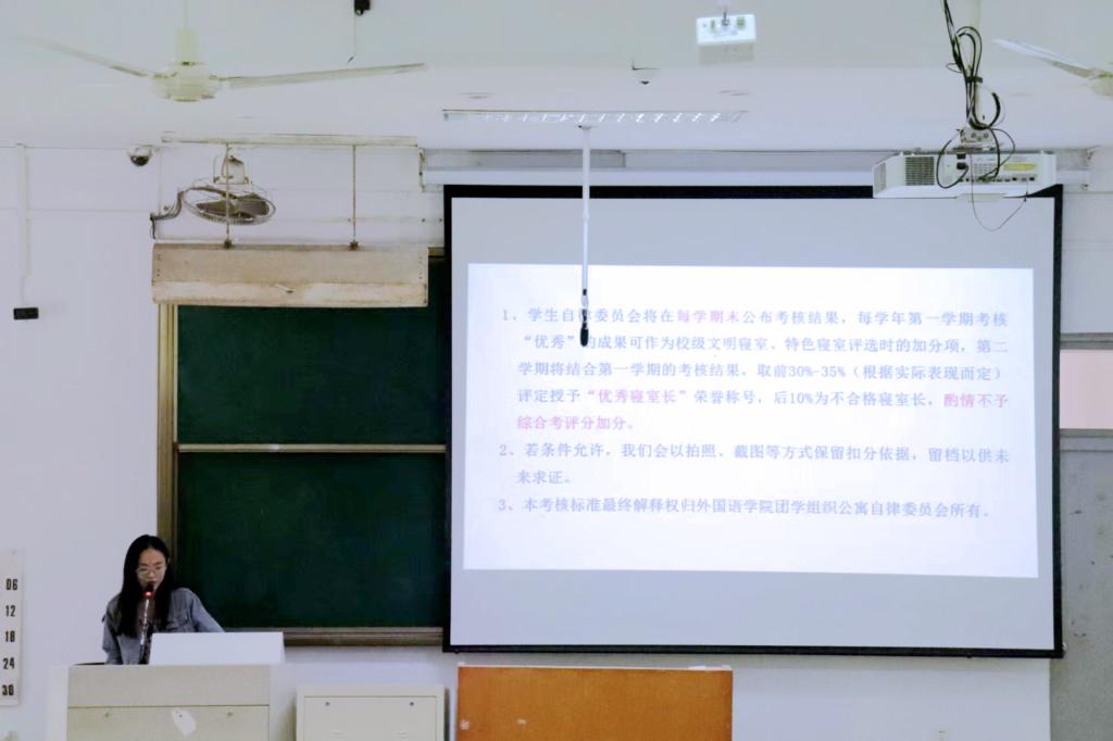 为在新学期推进寝室安全、卫生和文明建设,10月11日中午,外国语学院于A2教室召开全体生活委员及寝室长培训会。本次会议由公寓辅导员李丹娜出席、学生公寓自律委员会干部徐畅、郑婵婵主讲,外国语学院全体生活委员及寝室长参加。