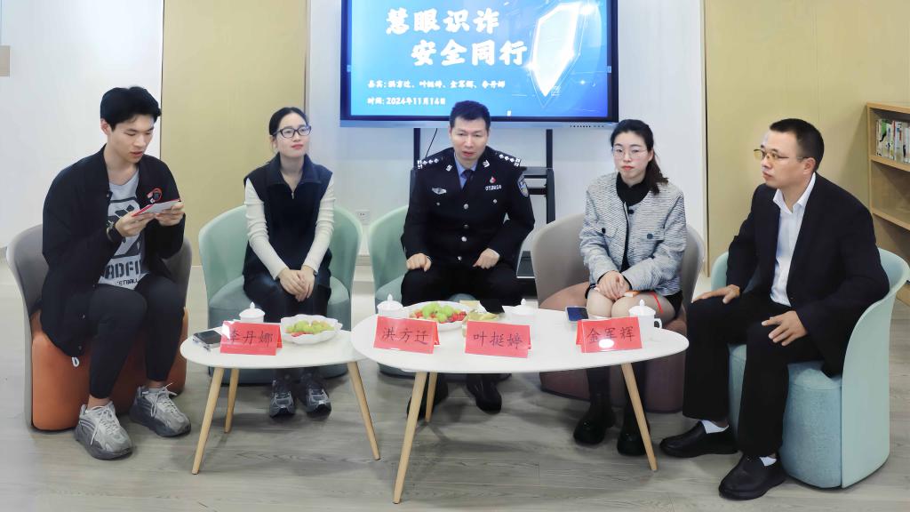 为提高外国语学院学生安全意识以防范诈骗,11月14日下午,外国语学院于广文书院二楼举办以“慧眼识诈、安全同行”为主题的第三十五期午茶会。本次午茶会有幸邀请临海市公安局大洋派出所驻校民警洪方迁,安全保卫部办公室副主任叶挺婷,临海保安队队长金军辉,外国语学院分团委书记李丹娜出席,午茶会由联络部干部杨威主持,23、24级安全信息员及主要班委参加。