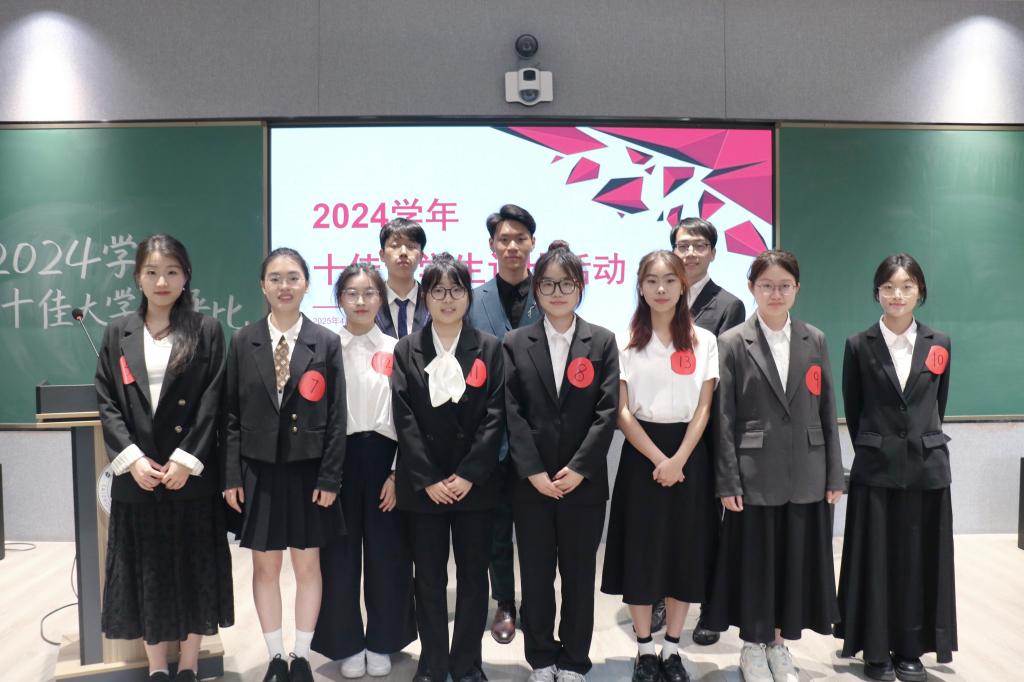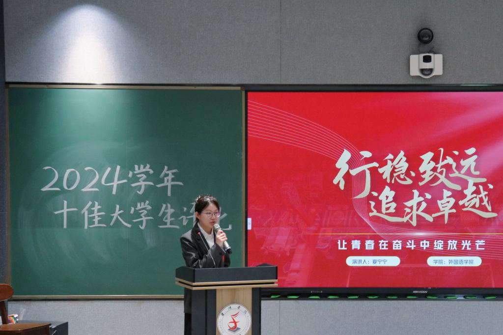 自主申报与班级推荐,13名候选人入围终评。现场展示环节,参评学生通过PPT全面呈现学业成绩、竞赛奖项、实践成果、思想品德及特长发展。其中,既有专业绩点突出、斩获专四优秀及省级赛事奖项的学术标兵;也有文体兼修,在省校运动会、艺术展演中屡获佳绩的多元发展典型;更不乏深入社区开展双语志愿服务,实现知识转化的实践先锋。
