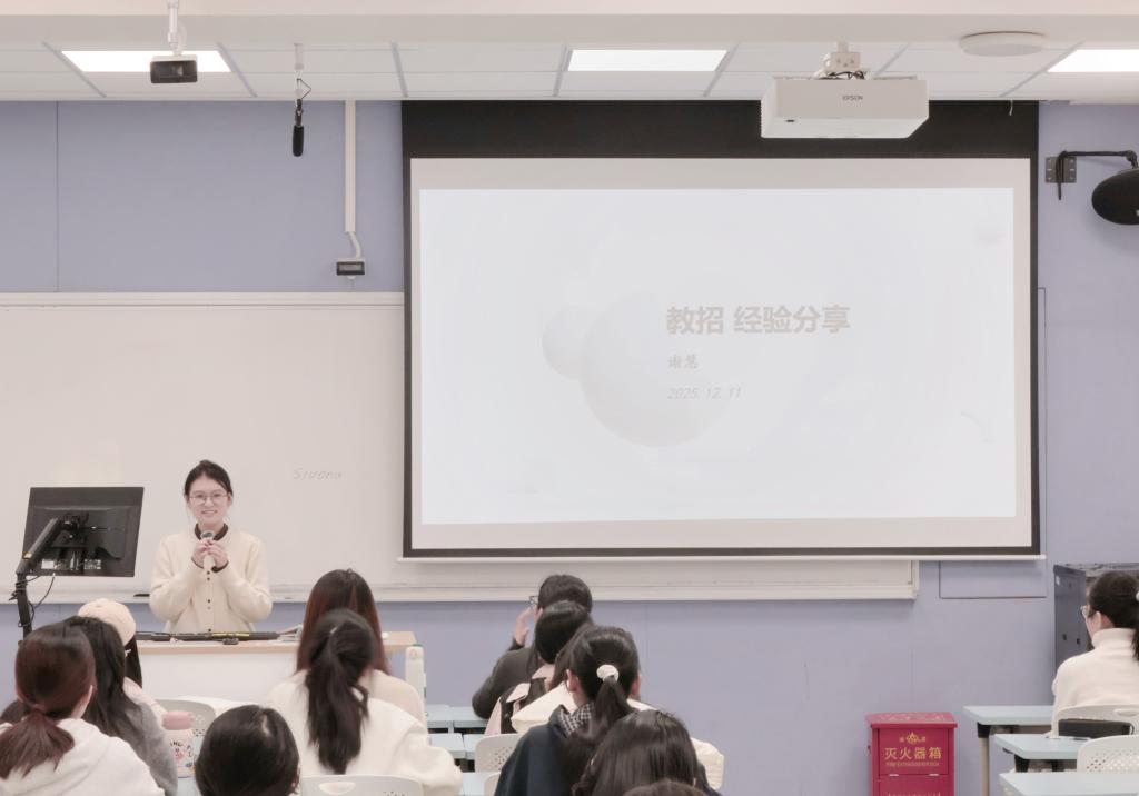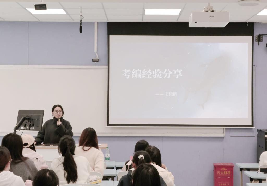 分享环节中,王腾腾围绕考试内容、备考经历与试讲技巧展开分享,她提到,积累课堂用语并在规定时间内开展模拟课堂练习,能有效提高课堂结构的完整性,还能为试讲增添亮点。谢慧则从备课角度切入,详细讲解了备课的核心内容和实用方法。答疑环节里,她们耐心解答了同学们提出的各类问题,最后还为现场备考学子送上成功上岸的美好祝福。