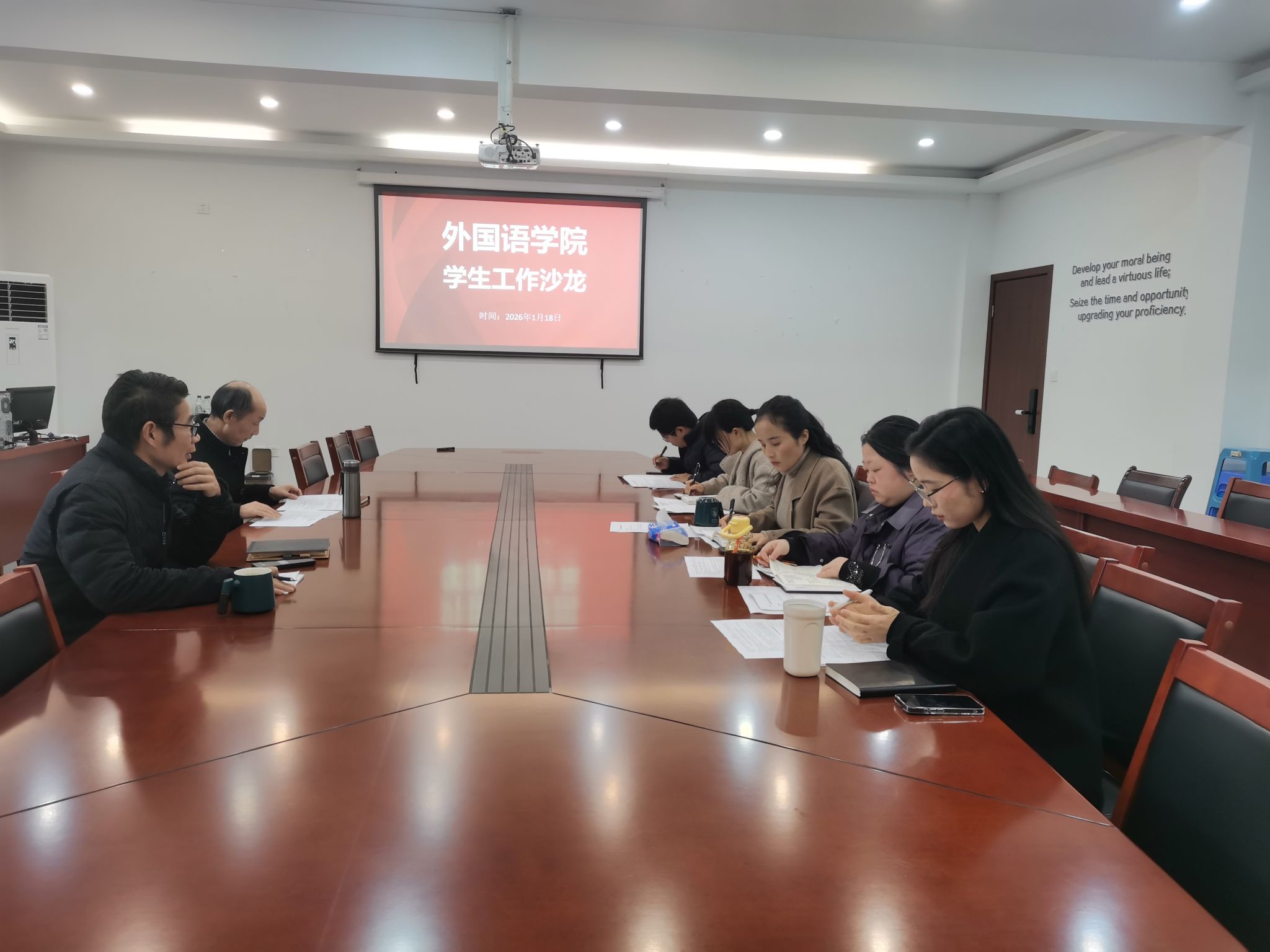 为深入解读学校最新政策,精准赋能辅导员职业发展,1月18日上午,外国语学院在4102会议室成功举办了2025年度学生工作沙龙。本次沙龙由学院党委副书记鲁建波主持,学院党委书记李涛出席并作专题指导,全体专职辅导员王丽琼、许颂捷、龙莲弟、李丹娜参加了本次深度交流。
