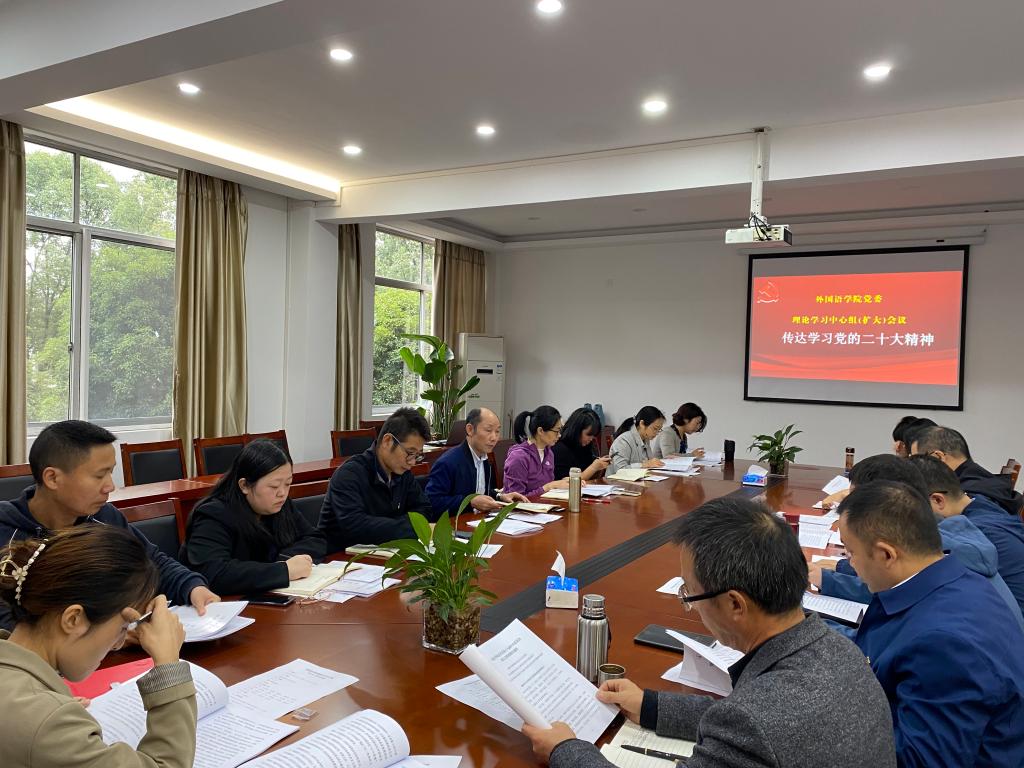 李涛书记简要介绍了党的二十大召开情况。党的二十大是在全党全国各族人民迈上全面建设社会主义现代化国家新征程、向第二个百年奋斗目标进军的关键时刻召开的一次十分重要的大会,在党和国家历史上具有里程碑意义。传达学习和贯彻落实党的二十大精神是外国语学院当前及今后一个时期最重要的政治任务。