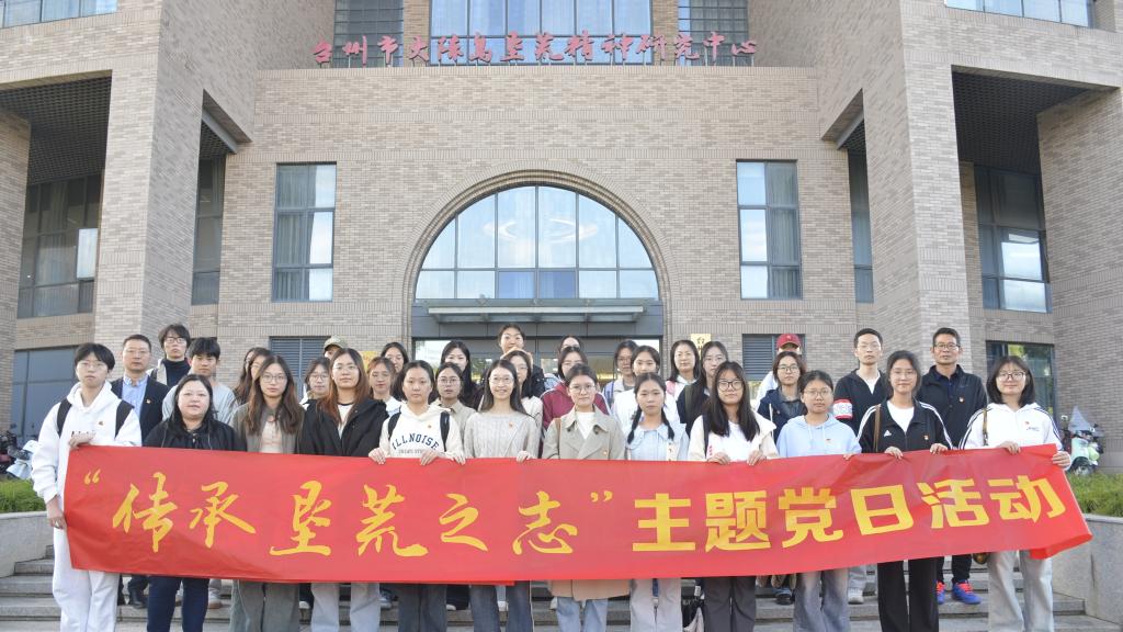师生党员在大陈岛垦荒精神研究中心前合影留念