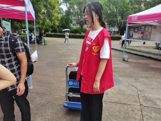 参加本次迎新活动的20级预备党员葛昕怡表示,虽然这是她第二次参加迎新活动,但是这次却很不一样。去年她是穿着黄色T恤,而今年是穿着红色背心并且戴着党徽的,身份有了变化,但初心还是不变的,无论是去年的她还是今年的她,一心想的都是如何去帮助这些初来乍到的同学们。尽管这么长的时间下来,她感到筋疲力尽,手掌也布满了污渍,但她觉得十分值得,也十分开心能够帮助新同学。