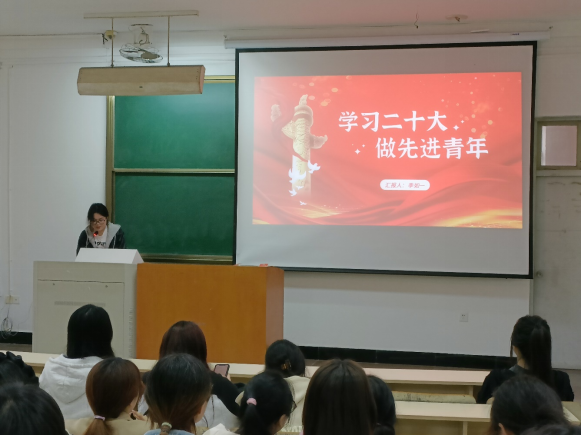 19英教3班预备党员赵琳飞以“青春心向党,奋进新征程”为主题,从学习二十大、回顾党的百年奋斗历程和奋进新征程三个方面的内容展开叙述。赵琳飞清楚地讲述了党的二十大的主题和意义、十年来党和国家经历的“三件大事”以及二十大报告提出的中国共产党的中心任务,继而通过100秒100年的短视频带领同学们重温了党的百年奋斗历程,总结了团结奋斗精神是中国人民创造历史伟业的必由之路。