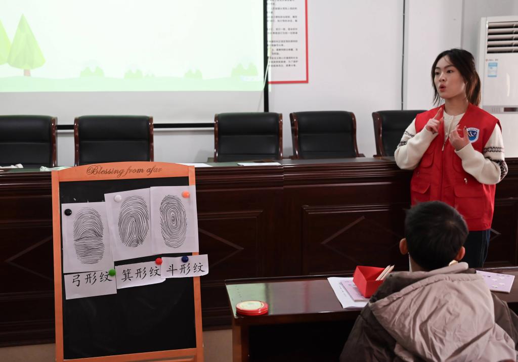 音乐课堂上,金一诺同学带领孩子们学唱经典歌曲《学习雷锋好榜样》。在“忠于革命忠于党”的激昂旋律中,孩子们用稚嫩而真挚的歌声表达对雷锋精神的崇敬之情。随后,金一诺以"指纹破案"的趣味故事开启科学课堂,通过展示三种不同类型的指纹图片,向孩子们讲解指纹在刑侦技术中的重要作用。她形象地将指纹比作“每个人独一无二的生命密码”,激发了孩子们浓厚的探索兴趣。在实践环节,孩子们纷纷在纸张上印下自己的指纹,热烈讨论着各自的指纹类型。
