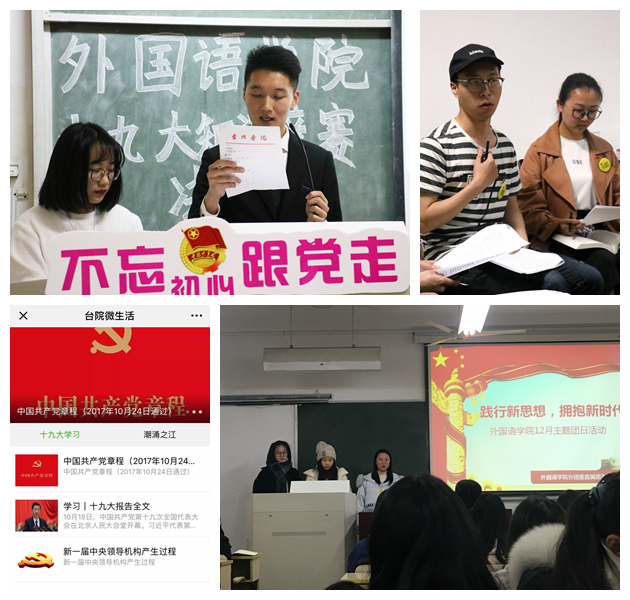 据了解,党的十九大召开以来,外国语学院党总支、分团委以高度的使命感和责任感面向学院各层面开展了学习活动。在面向全体学生层面上,学院主要以每月一次的主题团日活动为主要集中性学习平台,以每月一次的优秀团支部板报评比为补充内容,以学院微信公众号“台院微生活”“外语v站”为宣传阵地,以十九大知识竞赛、“红色留声机”红色经典有声朗诵、十九大主题班报设计比赛为创新形式,收到了学院师生的好评。期间,全院大一至大三35个团支部,850多名团员青年展开了多次集中学习,覆盖面较广,收效比较明显。