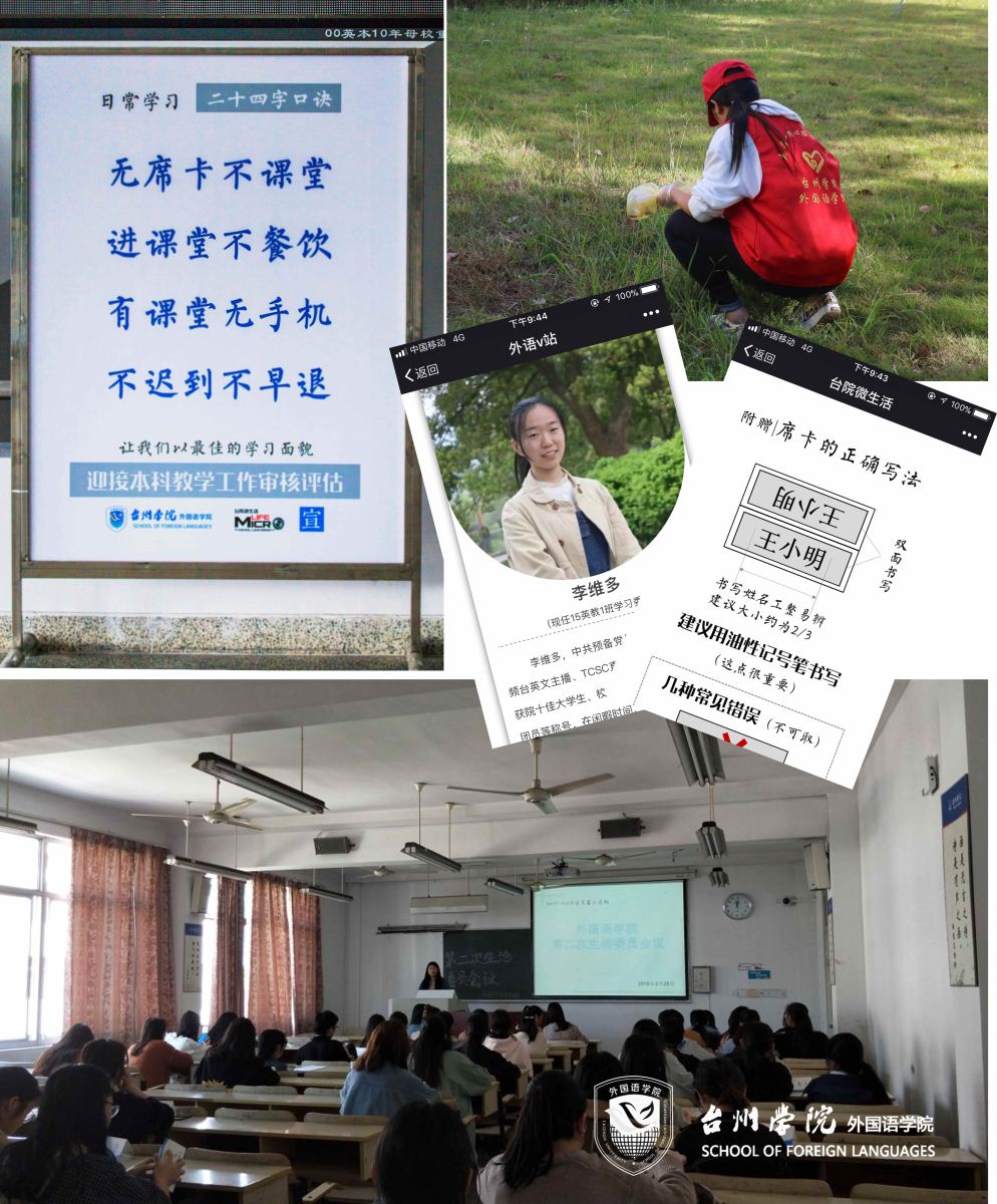 为配合教学评估工作,学院努力打造良好的迎评氛围,以海报、网络新媒体,志愿服务活动、文明寝室建设为载体推进相关工作。3月中下旬,学院在教学区、学生公寓区明显位置设置迎评海报标语,学生微信公众平台“台院微生活”“外语v站”以图解方式宣传正确使用席卡,开展创学风迎评故事、先进榜样、书籍征集活动专栏以先进事例影响人;学院青年志愿者协会发动全院志愿者开展“迎评促建”文明校园清理活动和“60+”签名活动积极宣传文明校园建设;3月29日,学院学生公寓自律委员会召开全院生活委员会议,以创建特色寝室项目申报制为载体,号召全院同学积极开展“书香寝室”创建活动