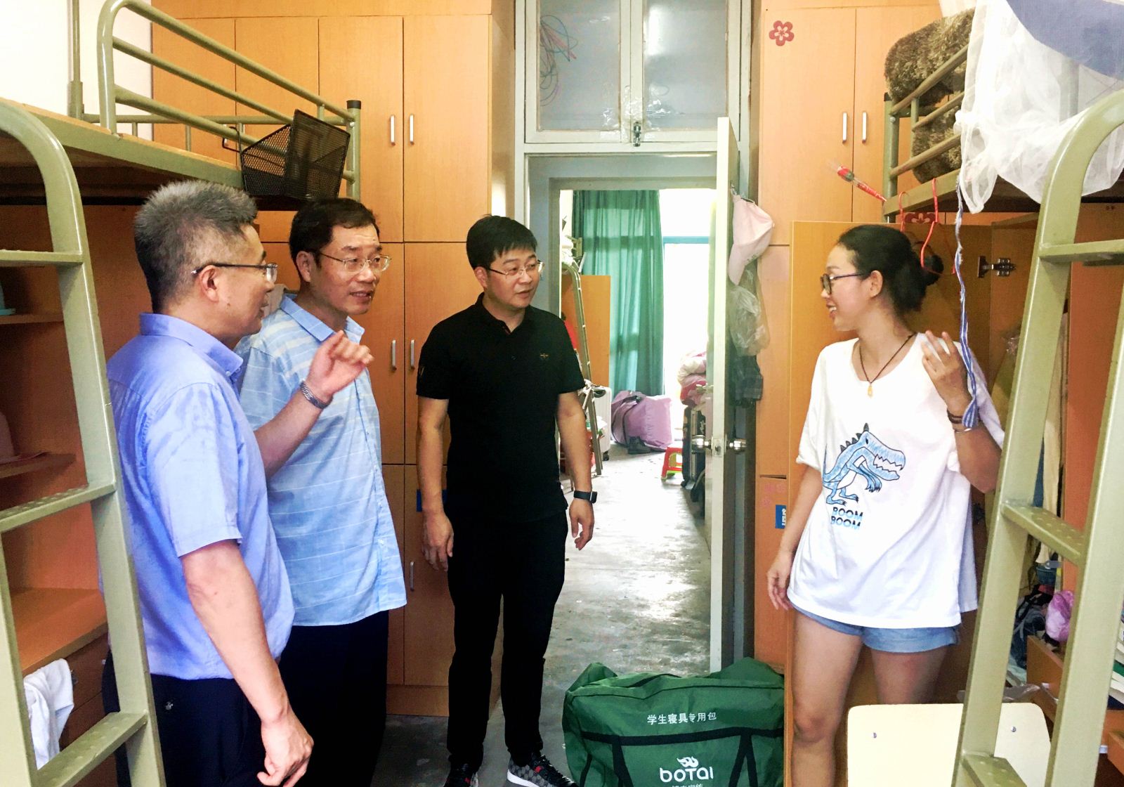 走访后,学院领导刘宏照、施安全、金宏伟还实地察看了公寓工作场所,深入了解了近年来外国语学院文明寝室建设情况。院长刘宏照在察看过程指出,学生公寓是大学生在校学习生活的重要活动场所,是学生成长成才的重要组成部分。下一阶段,学院将继续瞄准文明寝室建设和学生成长教育这个交叉着力点,进一步巩固用好现有的文明寝室建设平台,充分调动和发挥学院师生在过程中的主体作用。