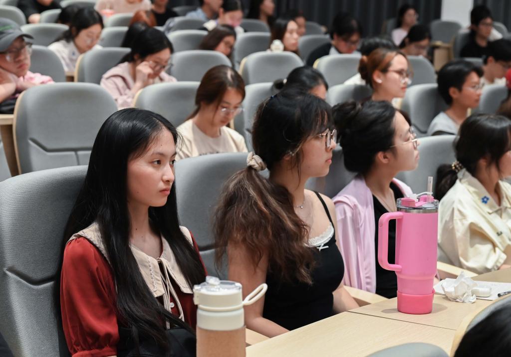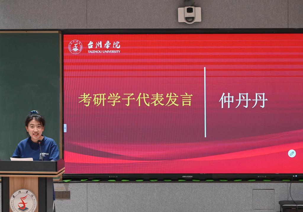 大会伊始,21英教4班仲丹丹作为考研优秀学生代表发言。她以“目标坚定、乐观自信、享受孤独”为关键词,讲述了跨专业考研的心路历程,寄语学弟学妹“每一步努力都算数”。她感谢学院在考研教室安排、包车送考、模拟面试等多环节提供的服务与支持,感恩考研路上给予她支持与帮助的师长。