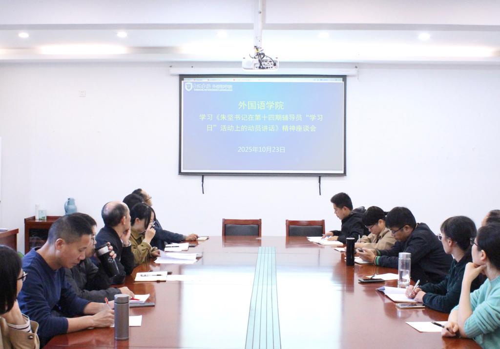 为深入学习与贯彻朱坚书记在第十四期辅导员“学习日”活动上的动员讲话精神,10月23日下午,外国语学院于4102会议室顺利召开专题学习座谈会。学院党委书记李涛、全体辅导员、班主任及研究生导师共同参与,学工办主任王丽琼主持。