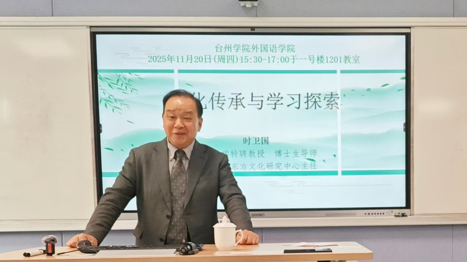 2025年11月20日下午,台州学院外国语学院特邀山东大学特聘教授时卫国教授,围绕“文化传承与学习探索”主题开展专题讲座。本会议由刘芬教授主持,学院教师和研究生参会。