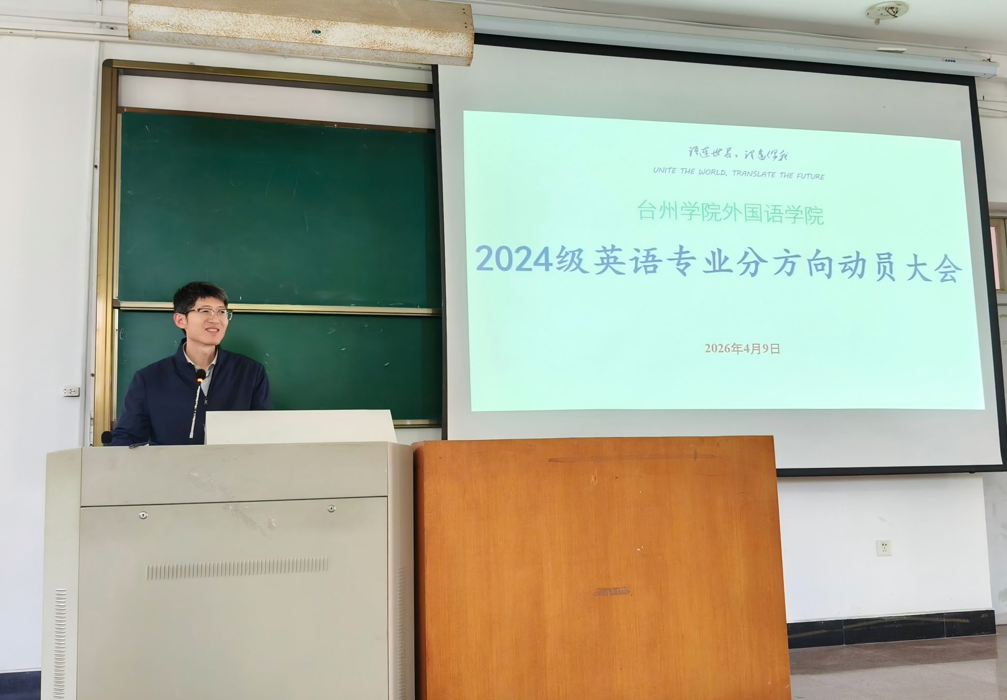 4月9日中午,外国语学院英语系在临海校区A3大教室成功举办了英语专业分方向动员大会,2024级英语系全体学生参加,外国语学院副院长崔瑞国出席并讲话,英语系主任刘常民主持。