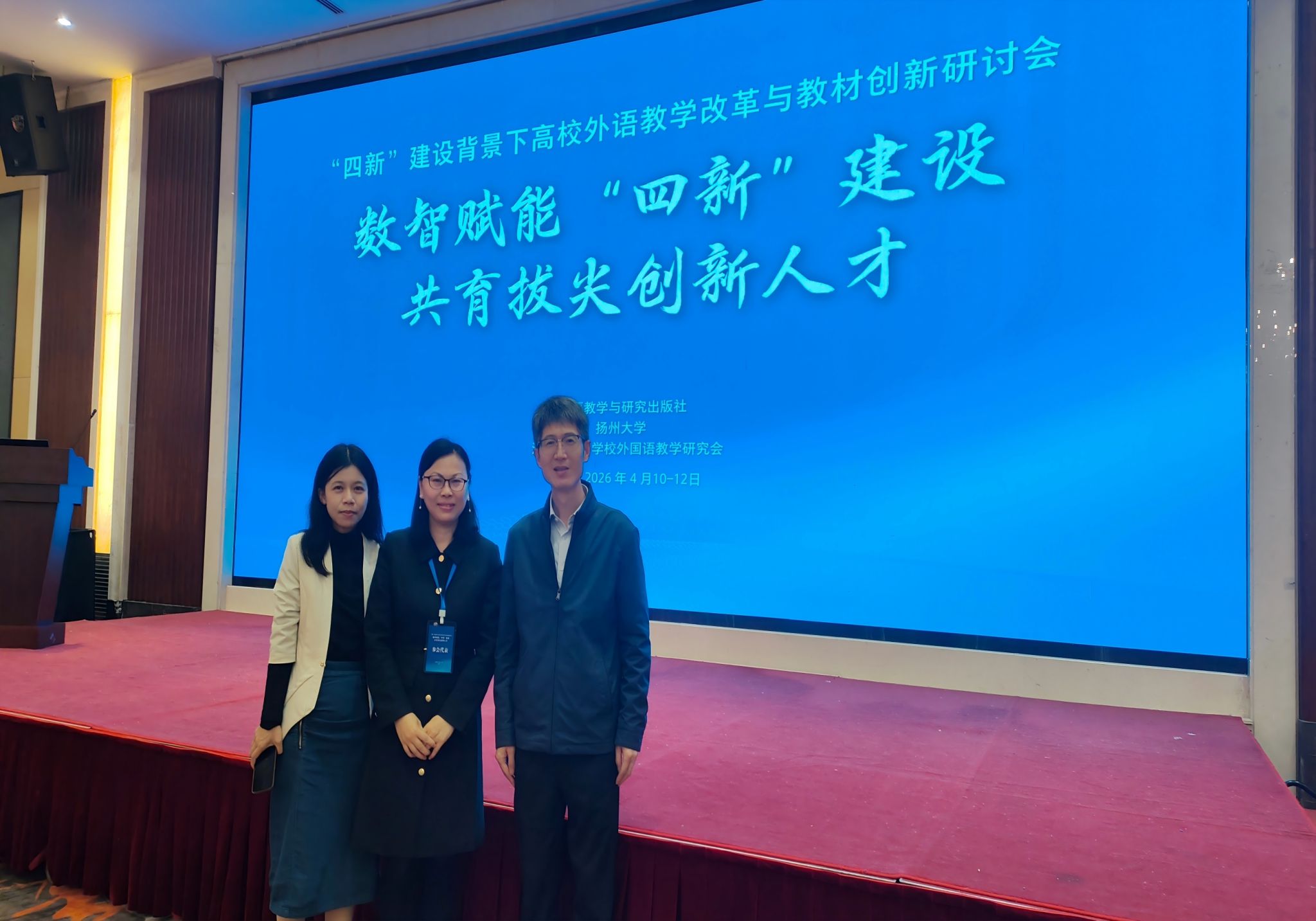 4月10日至12日,由外研社与扬州大学共同主办的“四新”建设背景下高校外语教学改革与教材创新研讨会在扬州召开。会议以“数智化赋能‘四新’建设与高等外语教育高质量发展”为主题,聚焦大学外语教学服务国家拔尖创新人才培养战略。来自全国各地的专家学者、高校外语教学负责人及骨干教师参会。外国语学院副院长崔瑞国、大外部主任汪琴和陈娴博士等参加此次会议。