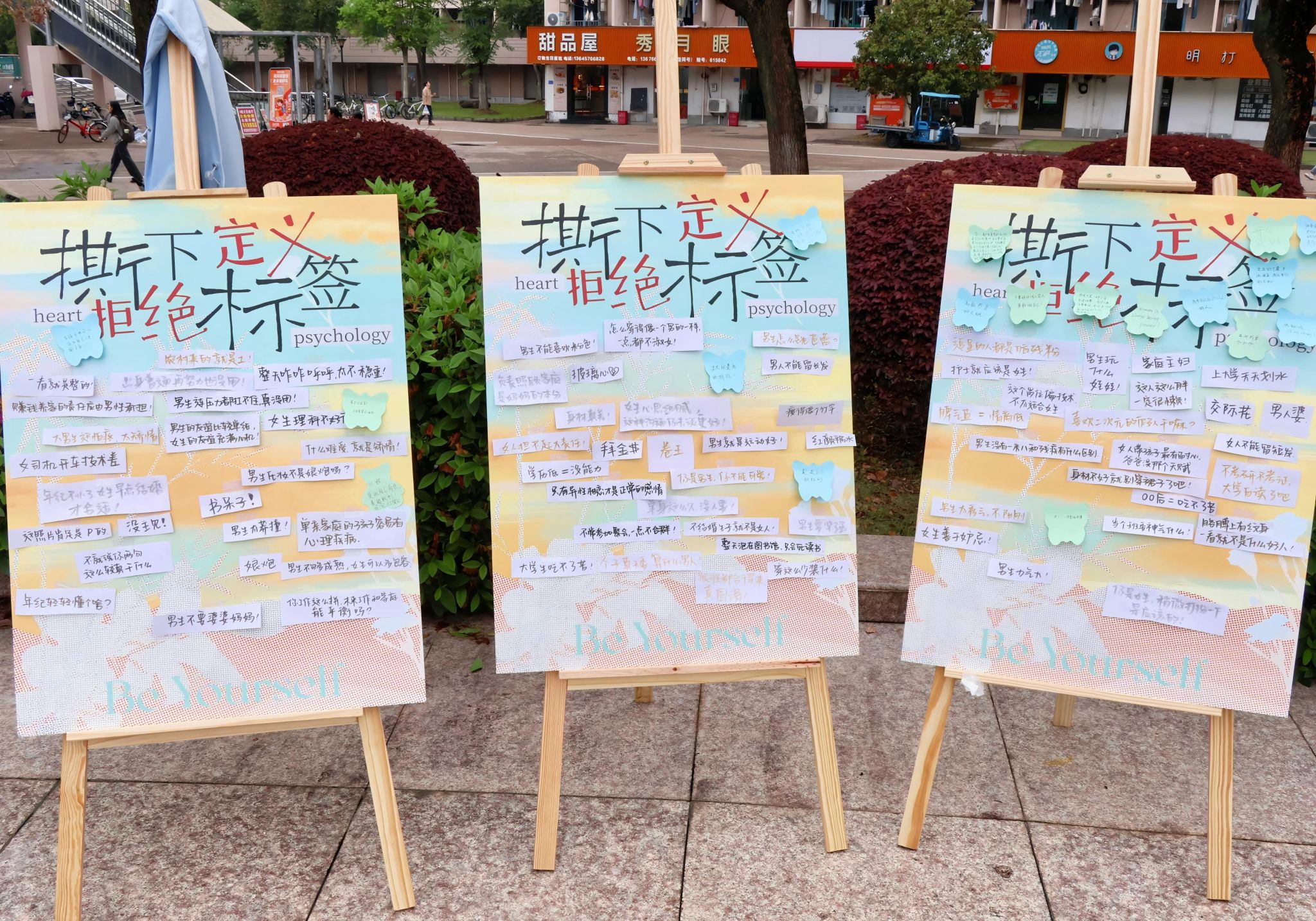 活动现场设置偏见标签墙,集中展示日常学习生活中常见的各类固化评价与片面刻板言论。参与学生驻足参与互动,主动撕下代表消极偏见的标签,认真书写自我接纳、自立自强的成长宣言,以严肃端正的态度正视自我价值,拒绝被外界片面定义。通过沉浸式实践体验,有效疏导学生心理压力,引导学生正视自身成长特点,增强自我认同感与自信心。