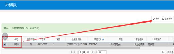 2、进入补考确认页面,选中确定要参加补考的课程,点击“确认”。