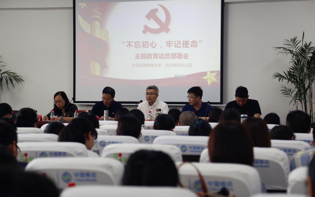 9月12日下午,外国语学院党总支召开动员部署会,认真学习贯彻中央、省委“不忘初心 牢记使命”主题教育工作会议精神,对我院开展主题教育进行动员部署。全院教师、学生党员参加此次动员会。