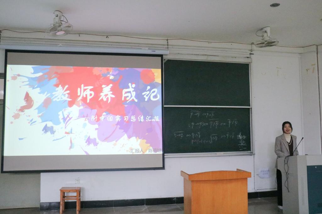 会议伊始,戴连云老师就本次实习总体情况作了点评。而后,共有台州学院附属中学实习组、仙居二中实习组、椒江区第五中学实习组等十一个实习点的代表上台发表总结,他们分别从学校概况、工作内容、校园活动、经验反思等四个方面进行阐述,内容详实,条理清晰,图文并茂。