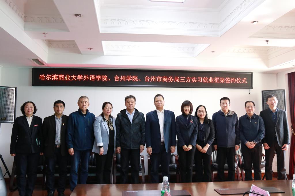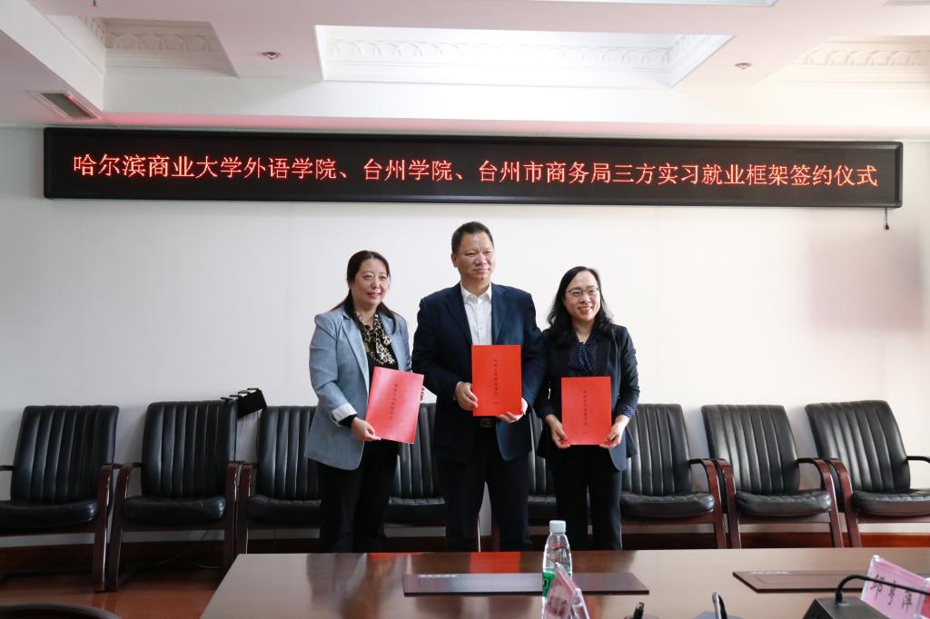 4月26日,在哈尔滨商业大学,台州商务局、哈尔滨商业大学外语学院、台州学院外国语学院举行了校政企三方实习就业框架协议签字仪式。台州商务局总工程师冯淼、哈尔滨商业大学外语学院院长魏薇、台州学院外国语学院副院长刘富丽代表各自单位在协议上签字。台州商务局电商处处长杨军、椒江商务局副局长李金俊、哈商大外语学院领导班子成员以及海猫进出口集团总经理吕东朔、星星电子商务有限公司总经理罗晓懿、拉夫澜徳医疗器械有限公司等有关领导出席仪式。