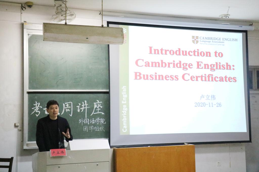 11月26日晚,国际商务单证、剑桥商务英语证书讲座于A3教室举行,本次讲座由台州学院外国语学院主办,外国语学院学生会承办,台州学院外国语学院副院长卢立伟主讲。