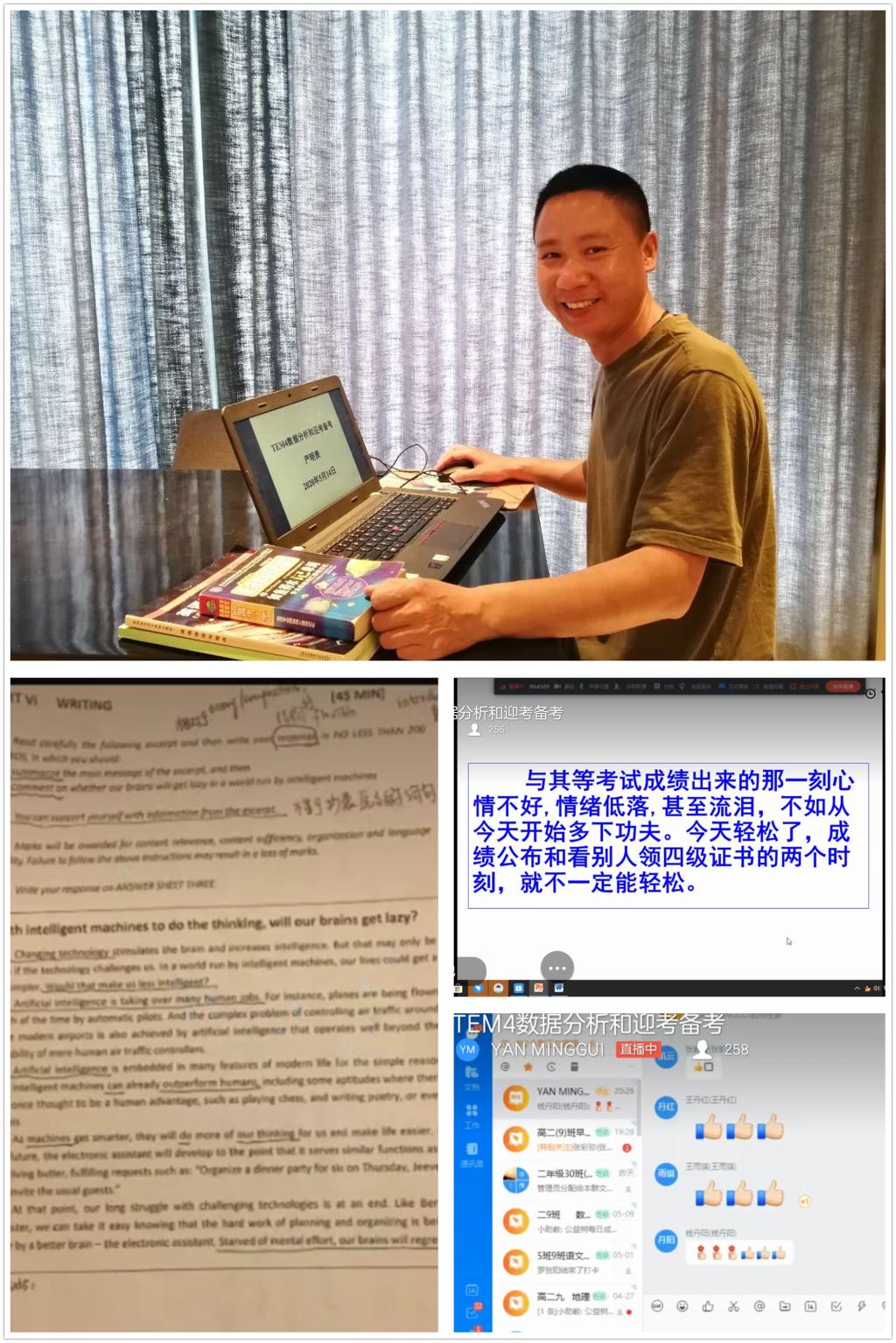 由于受疫情影响,今年全国大学英语专业四级考试将推迟举行,具体的考试时间尚未发布。如何复习备考,成为同学们关注的问题。5月14日晚,外国语学院邀请党员严明贵老师做题为《TEM4数据分析和迎考备考》讲座,近300位同学在钉钉上认真聆听。