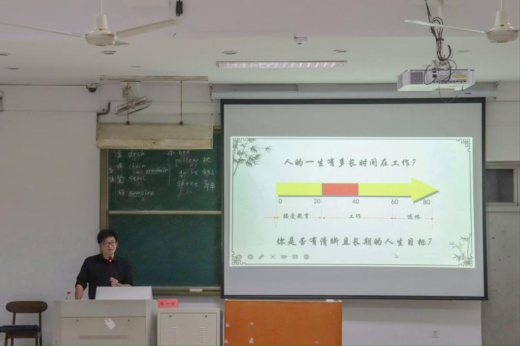当晚,台州市第一中学高级教师陈一军应邀为同学们作了题为“指向英语学科核心素养的中学阅读课的创新设计与实践”讲座。他从职业生涯的八个阶段出发,认为同学们要清楚地认识到自己未来的目标,深刻地了解到教师这一行业的重要性。他提出跨文化交际下中英互译对教学至关重要,有助于增加学生对西方文化的知识储备,培养学生的发散思维能力;建议同学们基于思想活动层次进行问题设计,有利于帮助学生们深入理解课文内涵。他强调,“坚持”是学习生涯的明灯,“不积跬步,无以至千里;不积小流,无以成江海”。