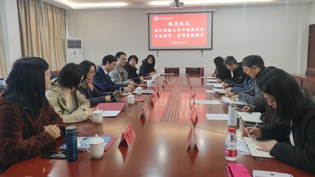 1月10日上午,浙江财经大学外国语学院副院长熊建国一行来我院调研交流。院长王刚、副院长卢立伟出席,副院长崔瑞国主持,学院英语系、商务英语系、跨境电商学院、教务办等部门负责人参加了座谈。