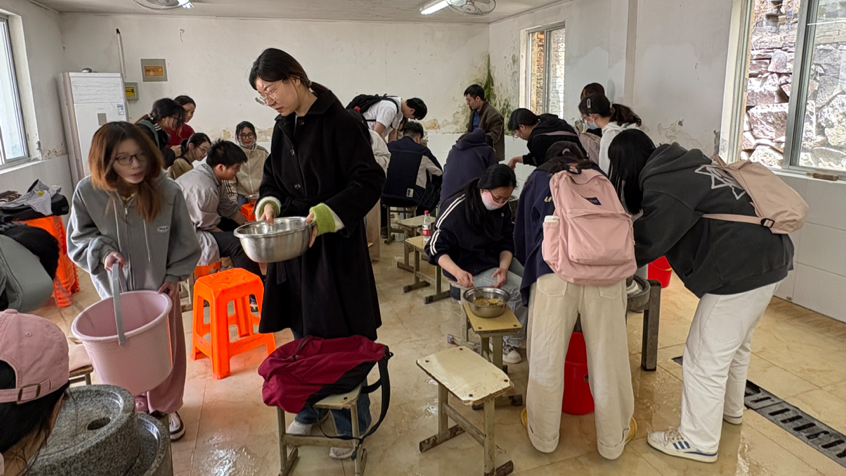随后,同学们分组体验包青团、做陶艺、磨豆浆等劳动实践活动。在做青团的区域,大家精心挑选自己喜欢的口味,揉、搓、包、捏,一个个圆润可爱的青团雏形逐渐呈现。在陶艺制作区,同学们发挥创意,将一团团陶泥在手中塑造成各具形态的陶艺作品,感受着泥土的温度与艺术的魅力。磨豆浆环节则成为本次活动的一大亮点。同学们围在石磨旁,认真聆听工作人员讲解磨豆浆的步骤与要点。在实际操作时,有同学因石磨转动费力而略显手忙脚乱,但在相互鼓励和帮助下,逐渐掌握了节奏,组员之间相互配合,三人缓慢转动石磨,一人小心翼翼地往磨眼里添加泡好的黄豆和水。随着石磨的转动,乳白色的豆浆缓缓流出,散发着浓郁的豆香。