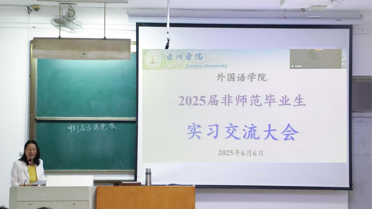 6月6日晚,外国语学院于临海校区A3教室举办英语和商务英语专业实习总结大会。会议由英语系副主任毛静林主持,英语和商务英语专业的2022级学生共同参与。本次大会全面梳理英语和商务英语专业学生的毕业实习情况,为即将踏入实习阶段的同学提供经验。
