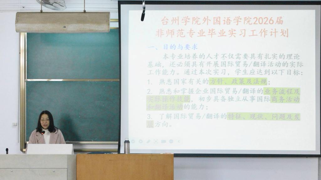 为保障2026届毕业生实习工作平稳有序开展,引导学生充分做好实习准备、明晰实习任务与相关纪律,外国语学院于12月18日在临海校区A3教室召开2026届英语、商务英语毕业实习动员大会。本次大会由英语系副主任毛静林主持,2026届英语、商务英语毕业生参加。