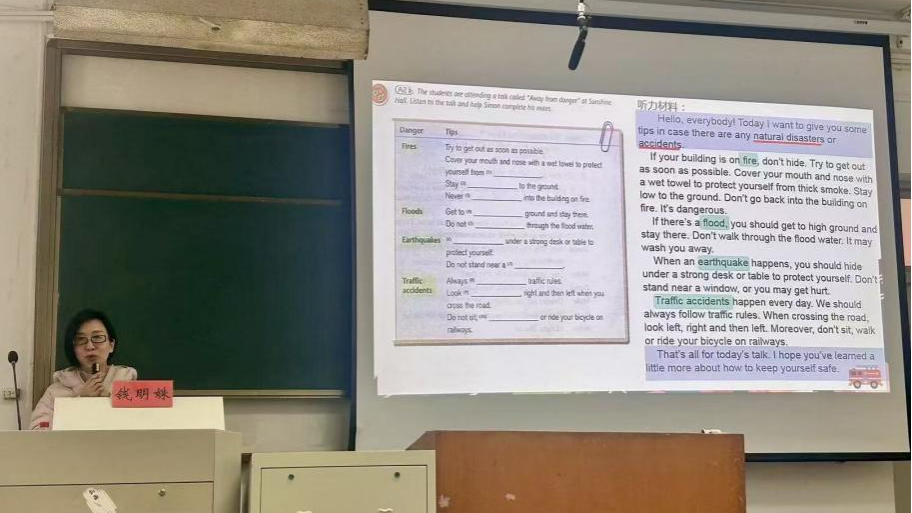 讲座伊始,钱老师以布鲁姆认知目标分类学为理论支撑,阐释活动观的核心要义:以学生为主体,引导学生在主题意义探究中,经历“学习理解—应用实践—迁移创新”三类层层递进的认知过程。在课例分析环节,她以“Away from danger”听说课等为例,直观展示围绕主题设计从词汇感知、情境对话到安全宣传展示的进阶活动。针对教学设计,钱老师系统梳理教案撰写规范,强调教材分析应从What、Why、How三个维度展开,学情分析可借助KWL框架,教学目标需围绕核心素养四要素分层制定。最后,她从听课方法、心理准备、师生相处三方面为实习生提出实用建议。